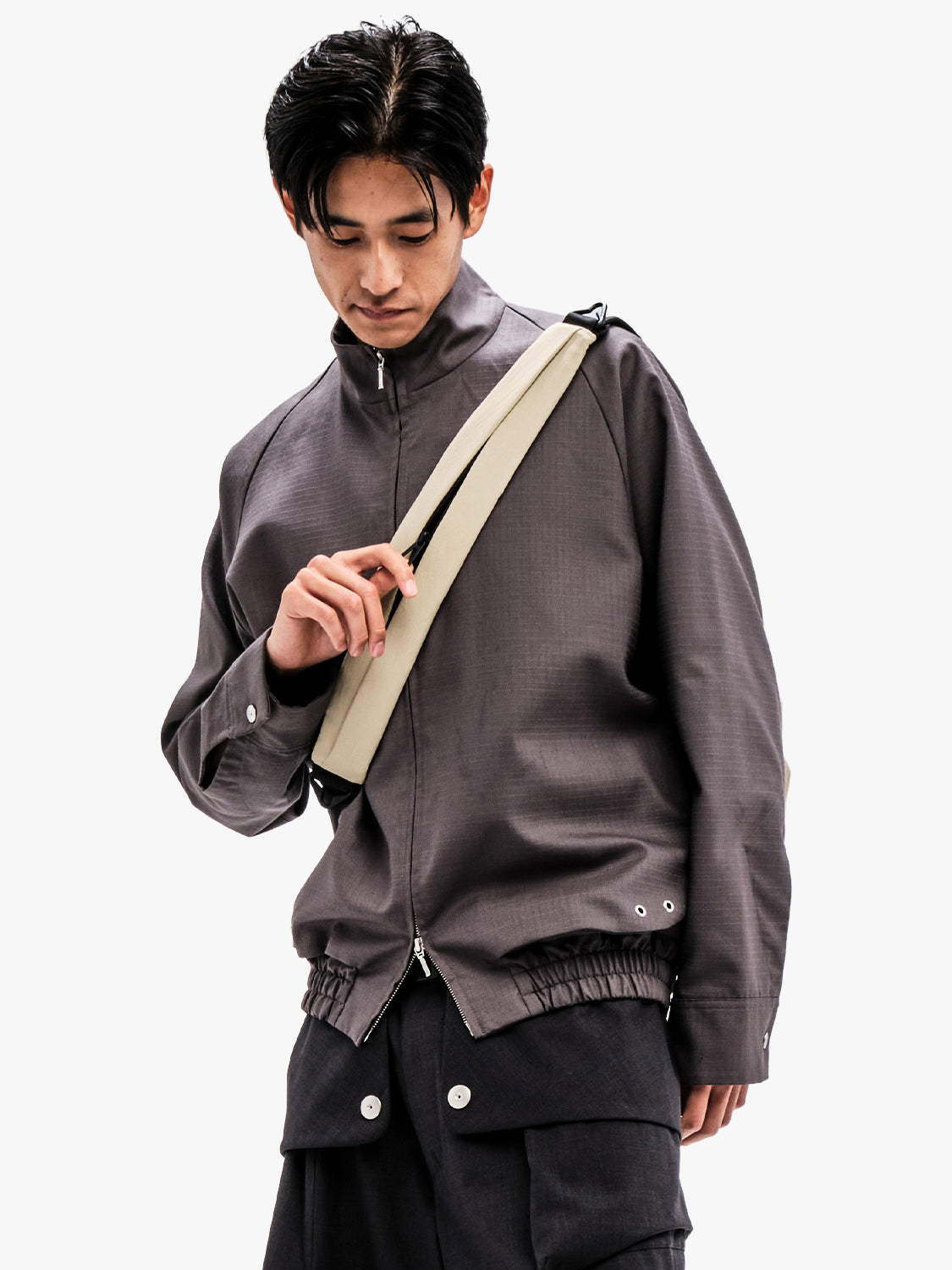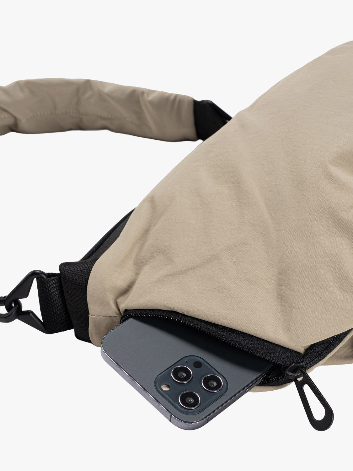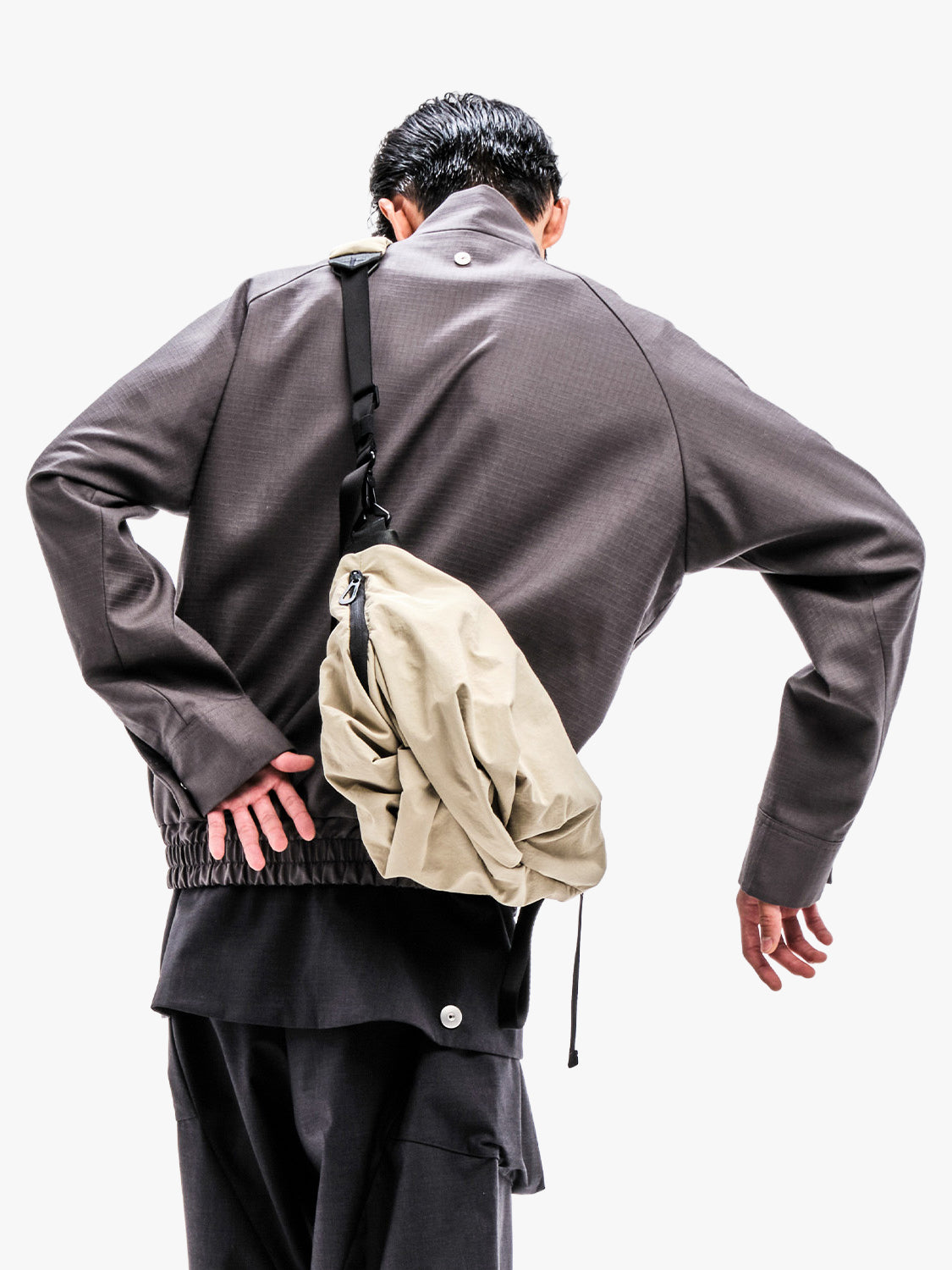 The ORNE is designed to follow and interact with the form of your silhouette. A playful twist in the material at the base of the bag creates a sense of movement and produces interesting folds in the fabric. The zippered ADDA shoulder strap can be worn separately as a minimal crossbody bag. The ORNE has one main compartment with an internal security pocket. Made from a beige Komatsu Onibegie Nylon material.