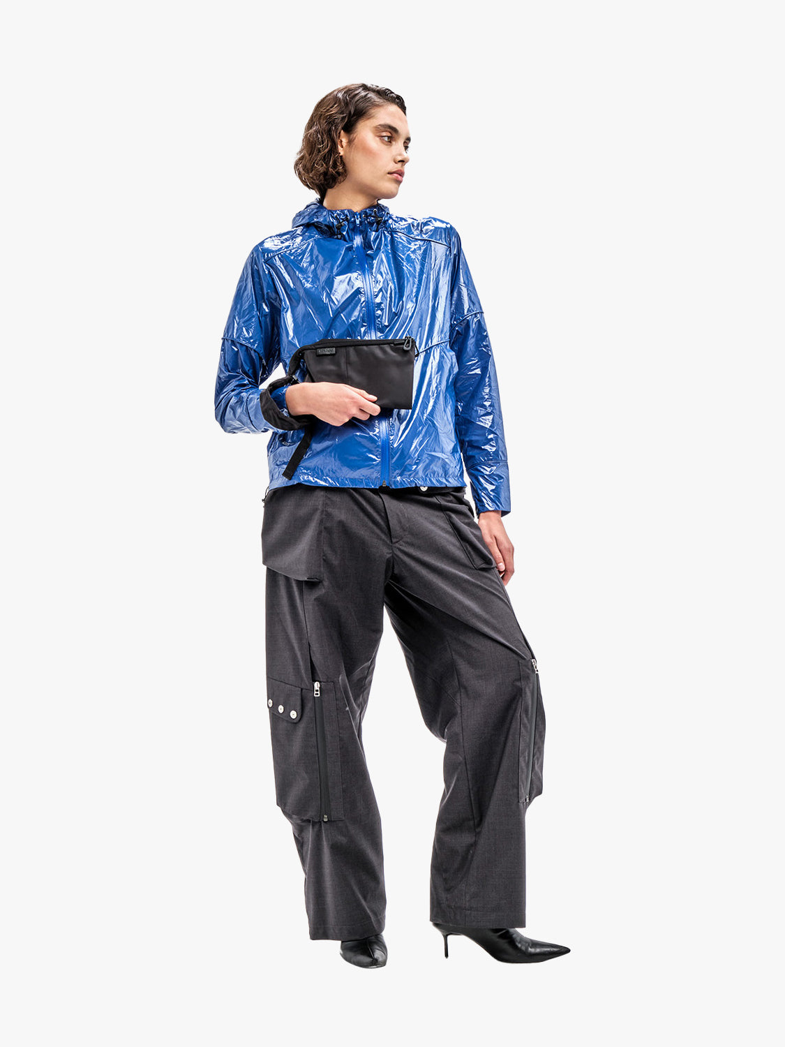 A practical folded pouch with an architectural form, distinctive to the design language of côte&ciel. Made from black 100% Nylon with a silky feel, featuring a black wrist strap, details and hardware.
