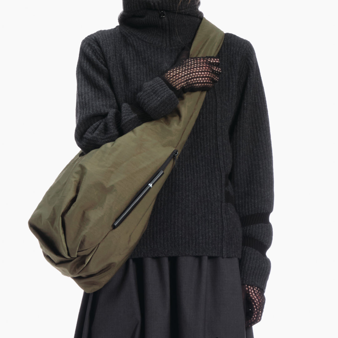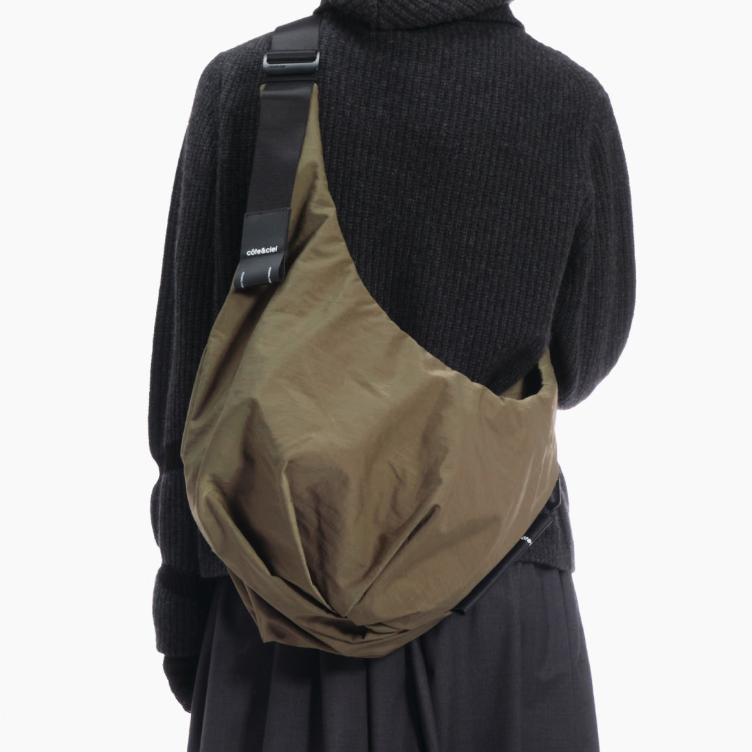 The compact version of the HYCO is a perfectly ergonomic crossbody bag. It follows the natural contours of the wearer’s body in a wrap-around way.