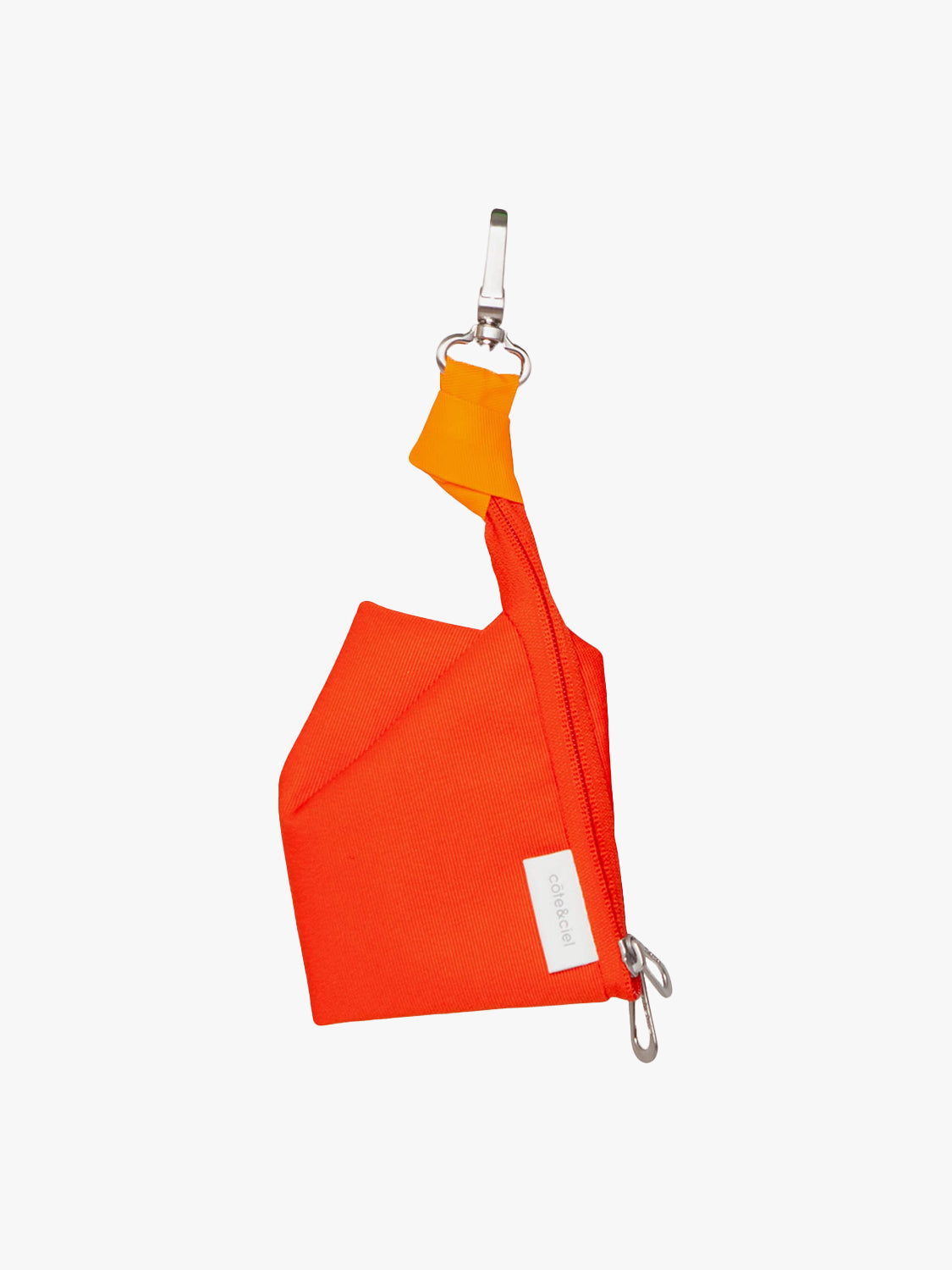 A practical folded pouch with an architectural form, distinctive to the design language of côte&ciel. Made from 100% Nylon with a silky feel and lustrous appearance in bright red with an orange strap and metal clip to attach to a larger bag, or belt loop.