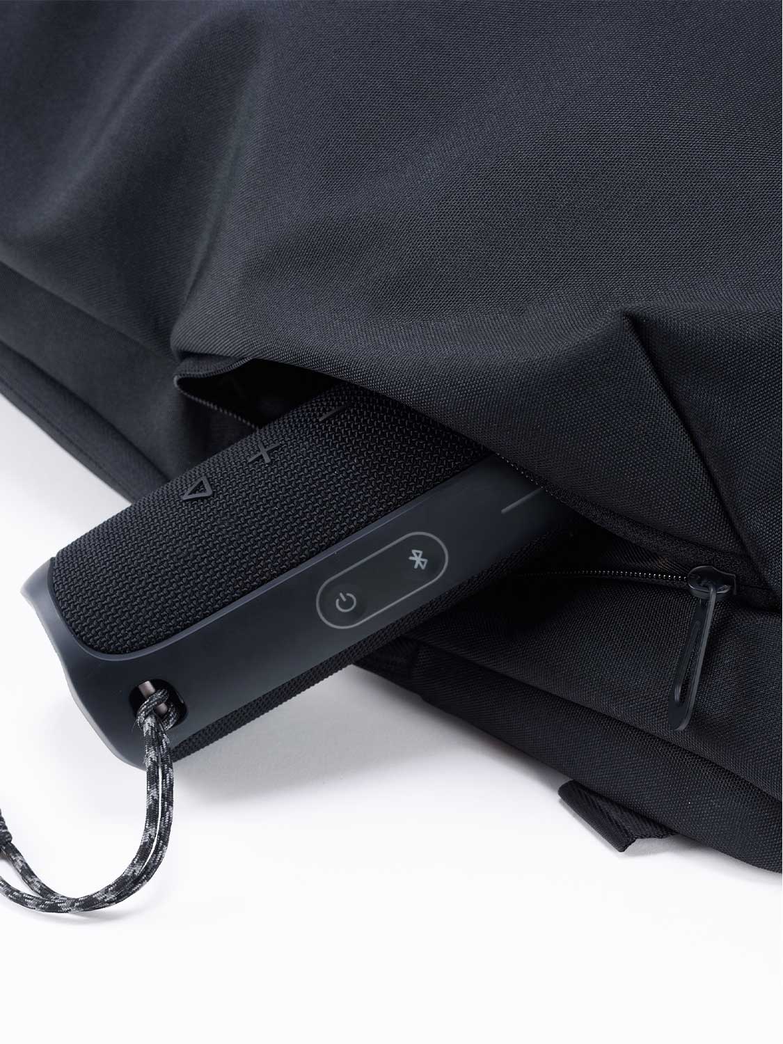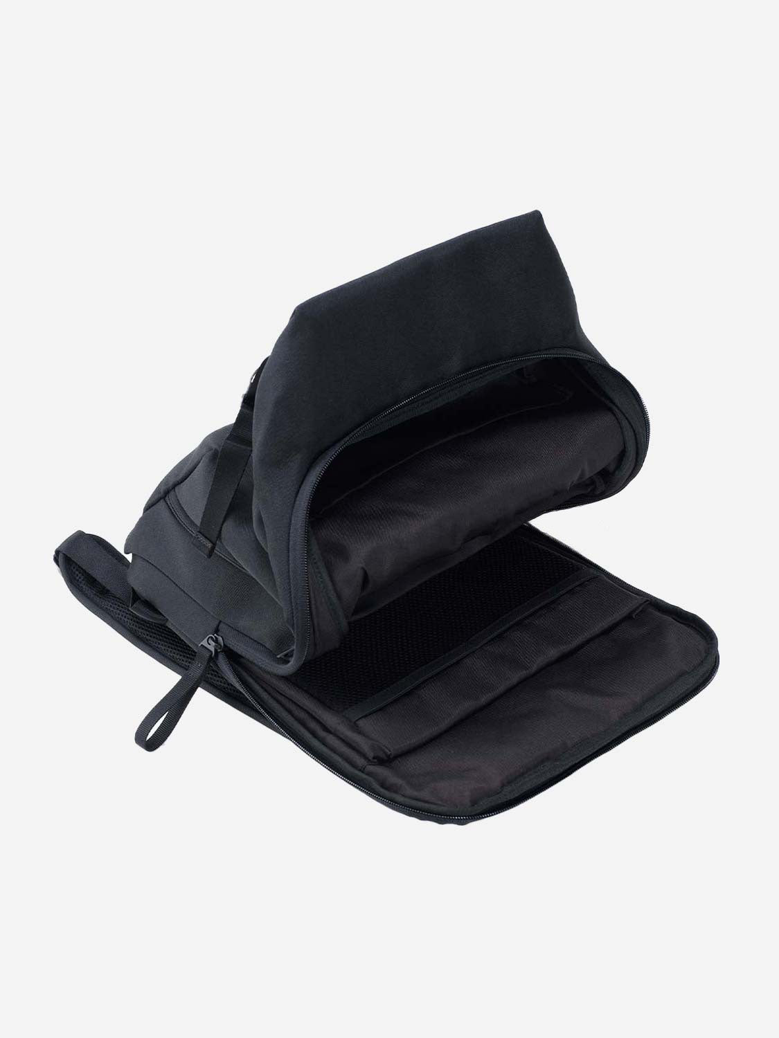 The SARU features three spacious external pockets: one at the top of the shell between the straps, and one down each side of the lower section of the main compartment. Opening the two buckles at the top, you will find the main compartment, featuring a padded device pocket that fits a laptop of up to 16”. This unique construction protects your laptop from theft. Two accessory pouches to the front of the laptop compartment are useful for keeping pens and cables organised and easy-to-access.