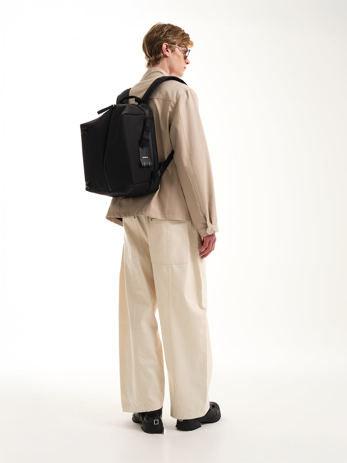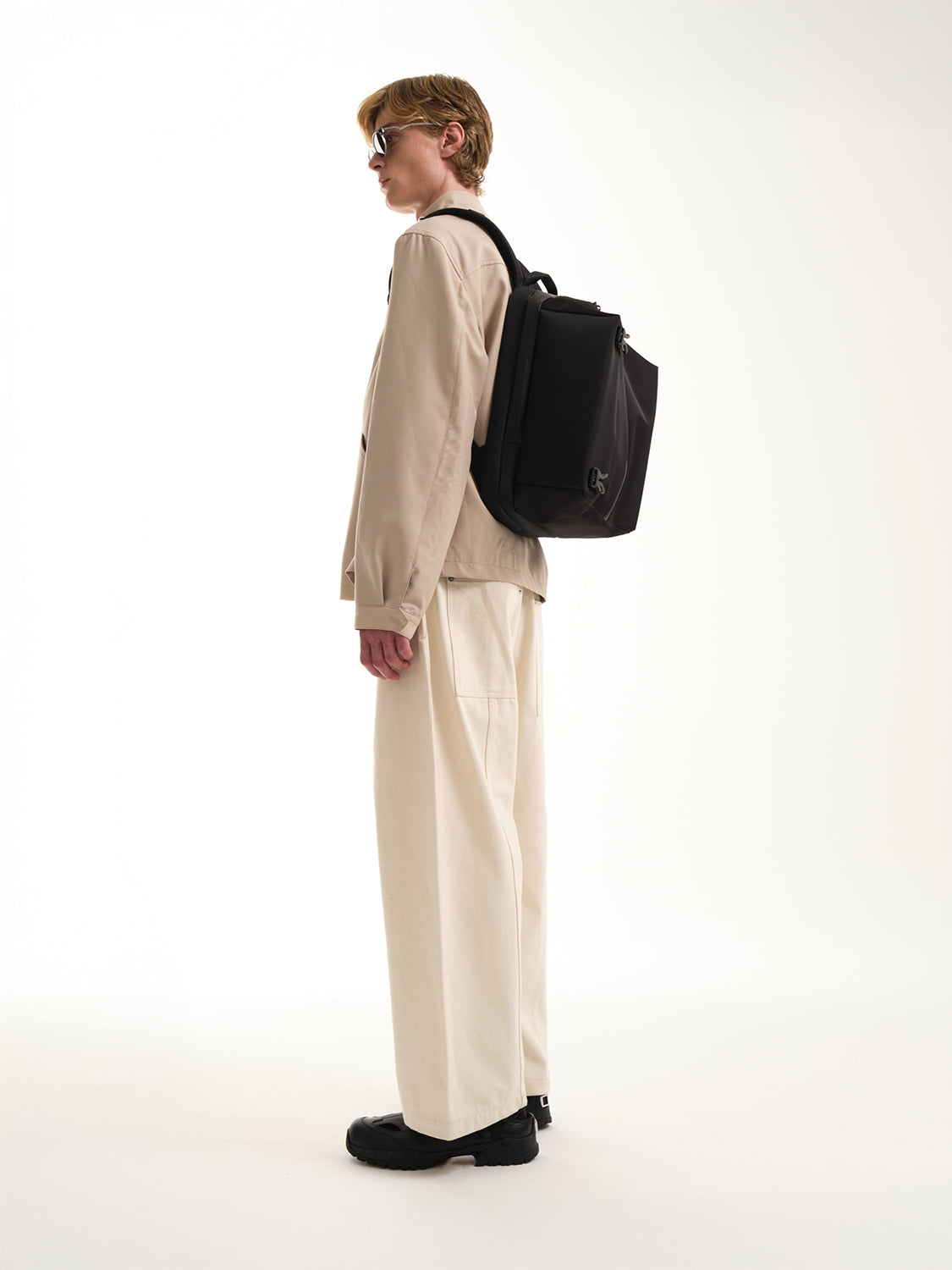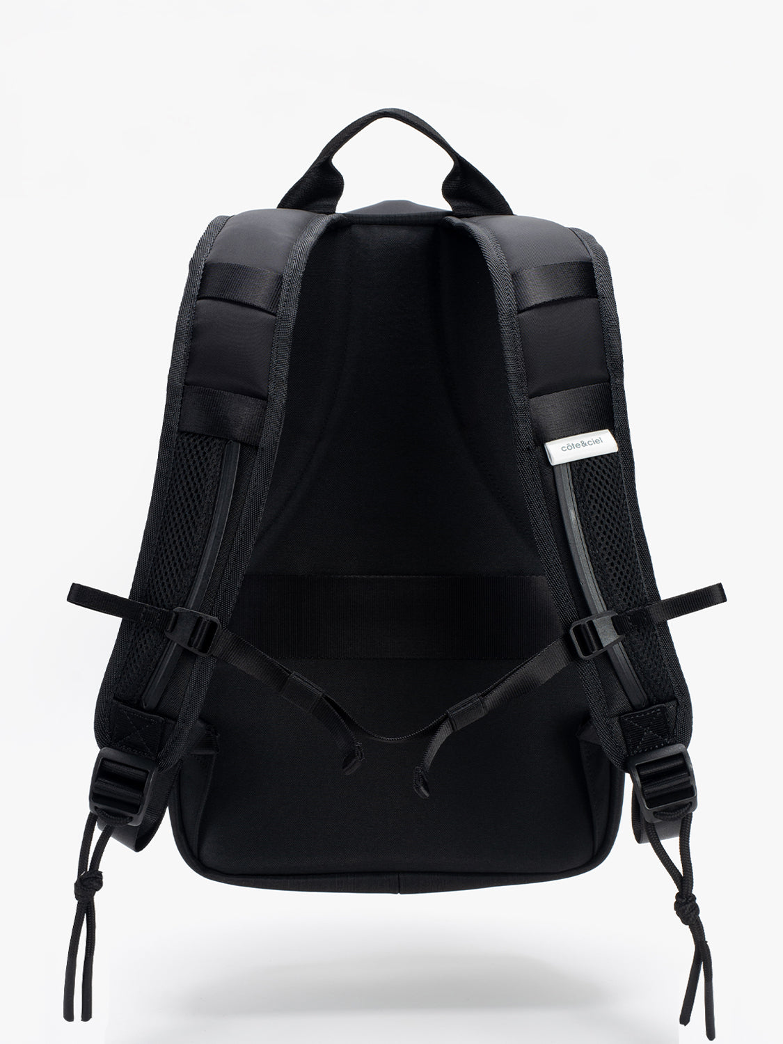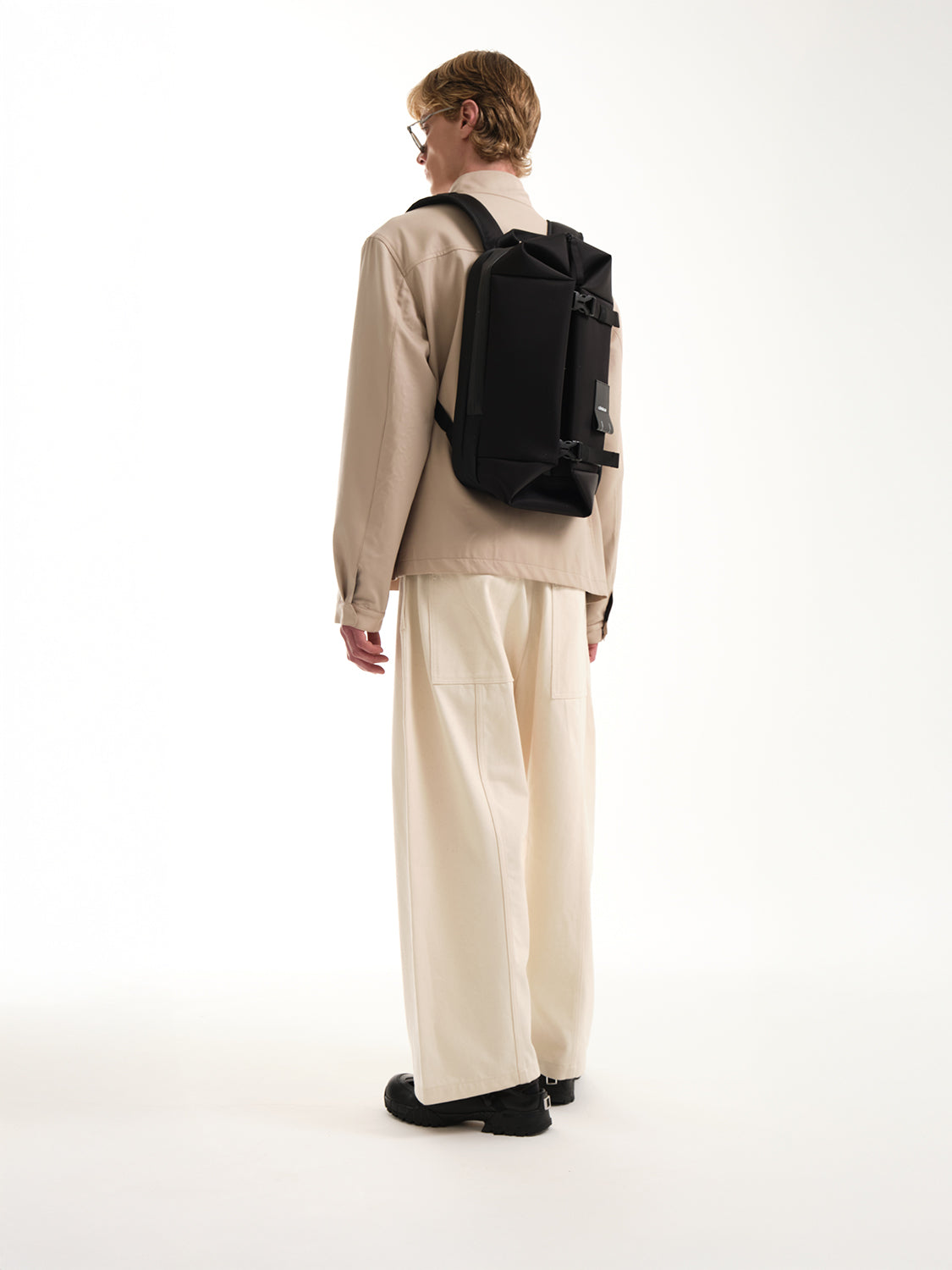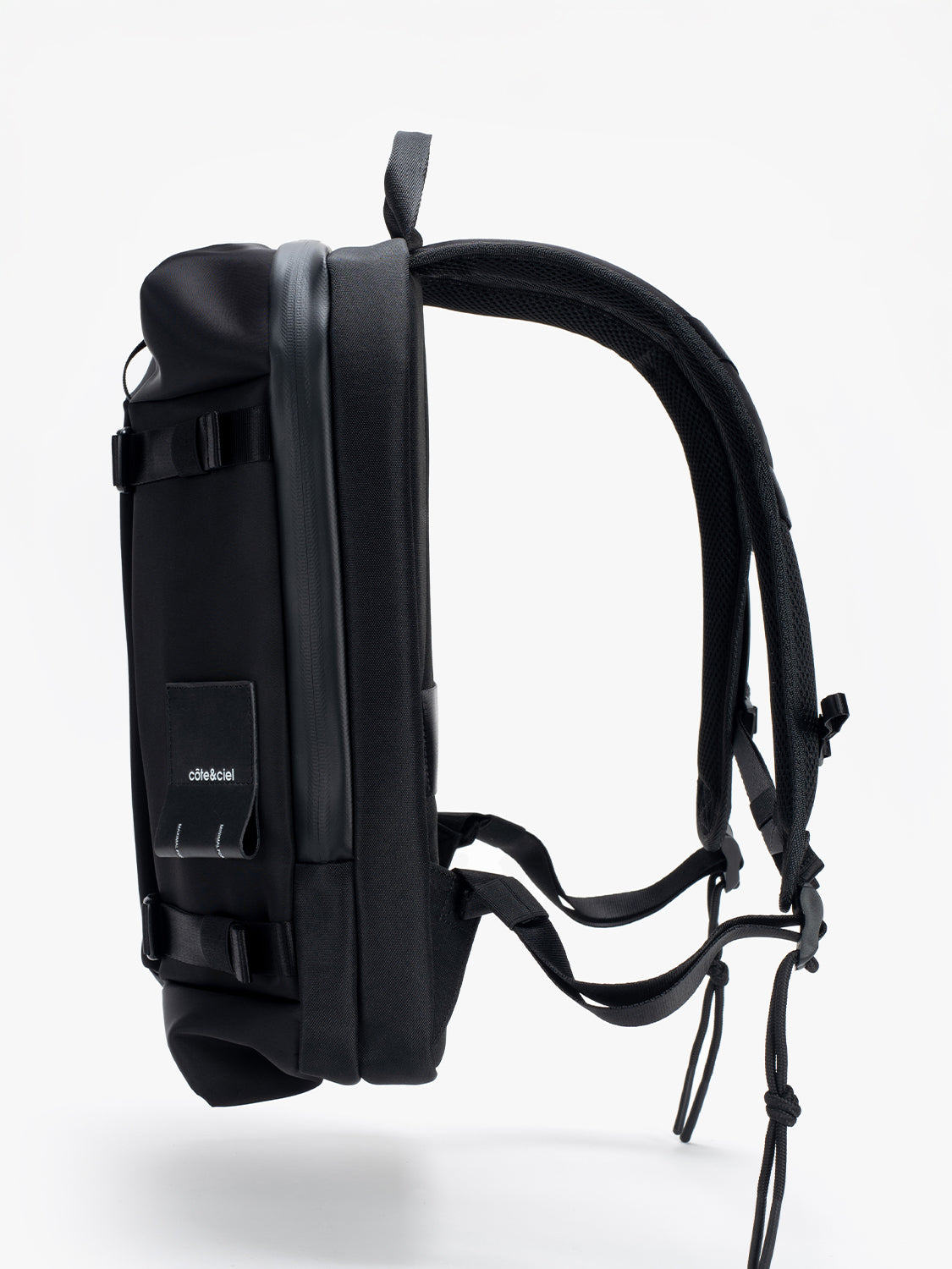 The YUKON returns in our iconic Sleek Black material. A compact backpack with a surprising feature: being able to open the front two buckles allowing the cubic-shaped front compartment to expand to full capacity.