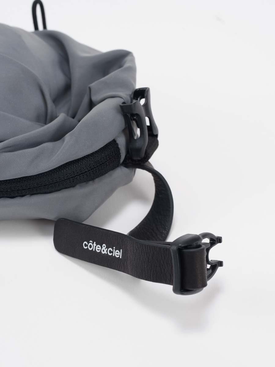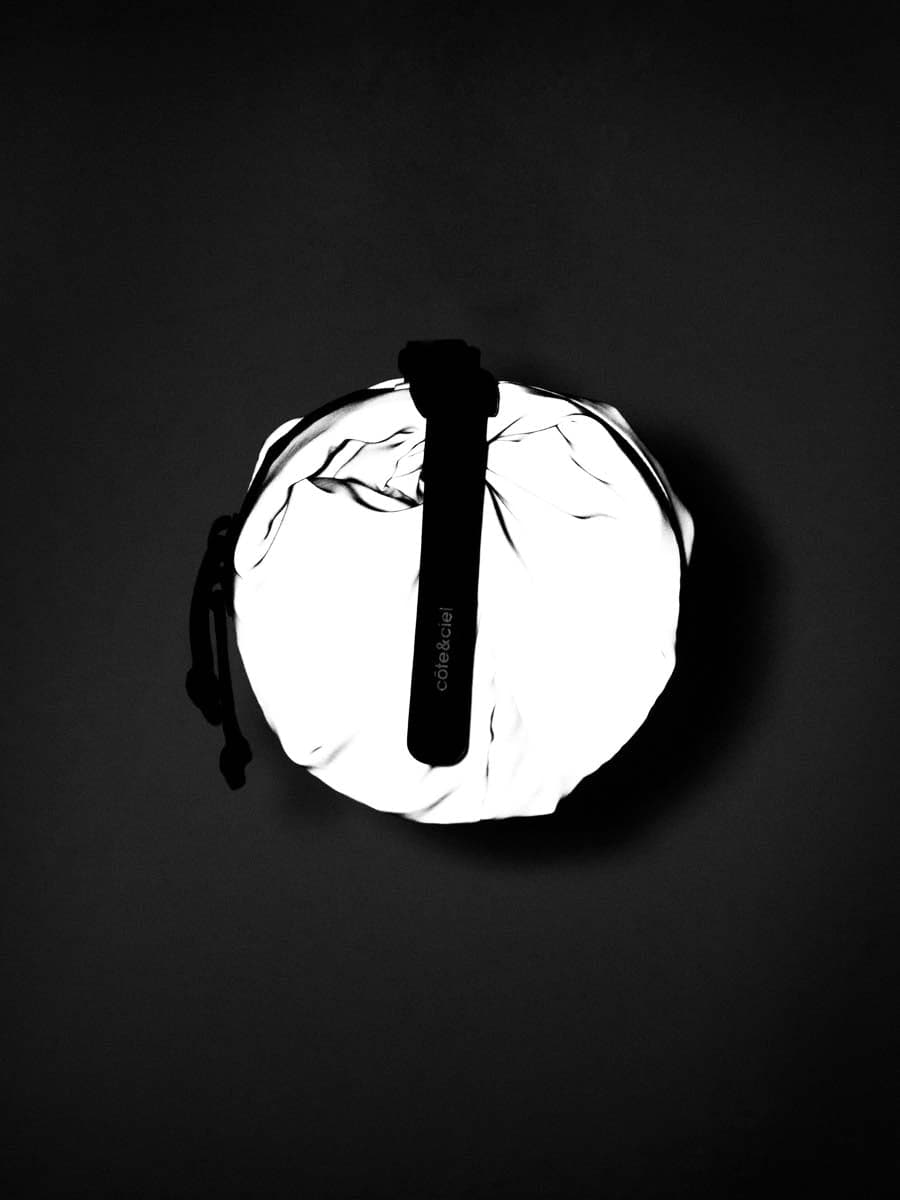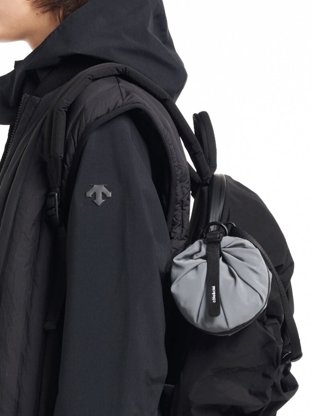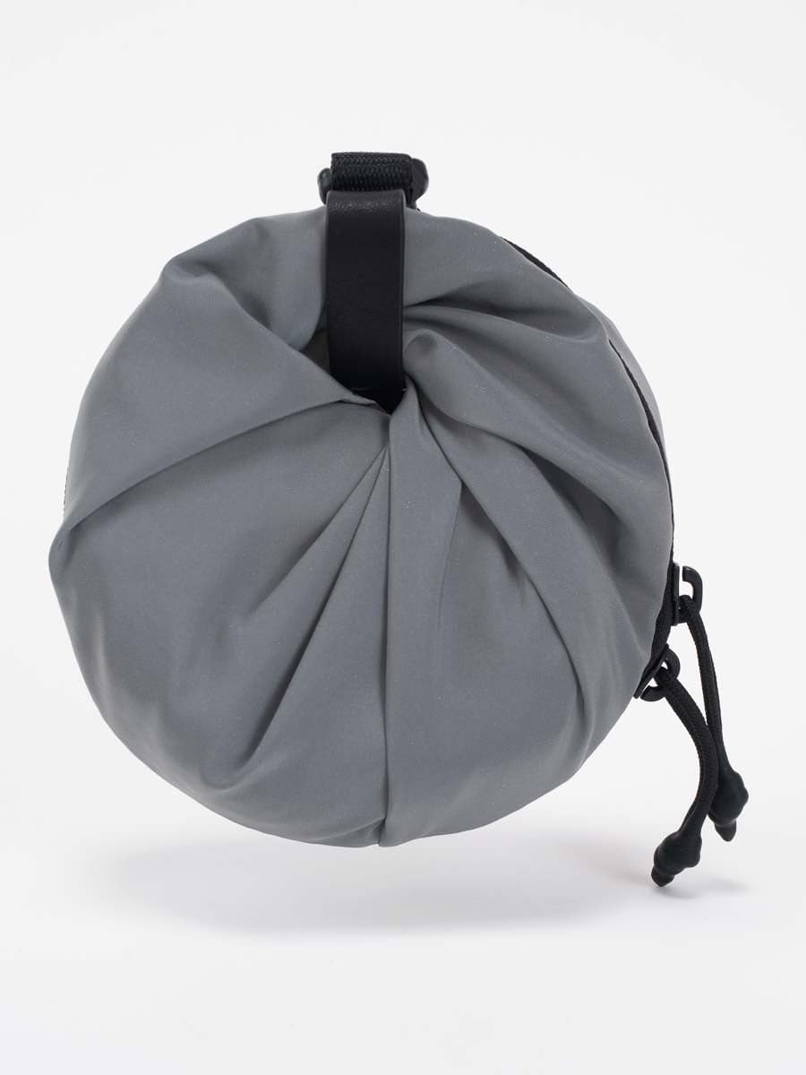 The AÓOS XS is a small twisted pouch with five separate inner compartments, one of which can be zipped up to hold small items in place. The all-around zipper allows for a full unfolding of the pouch. A leather strap secured by a buckle on the outside can be opened and the AÓOS attached to other bags as a small bag charm.