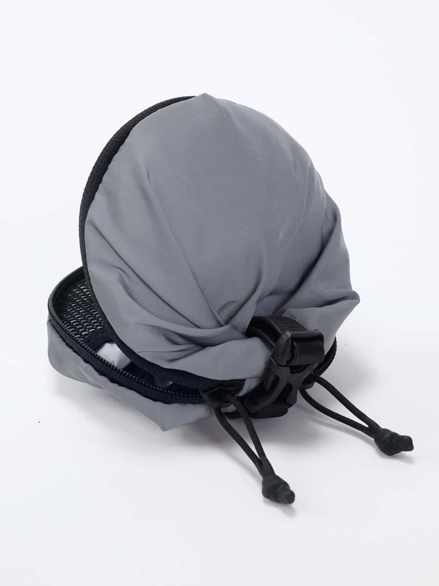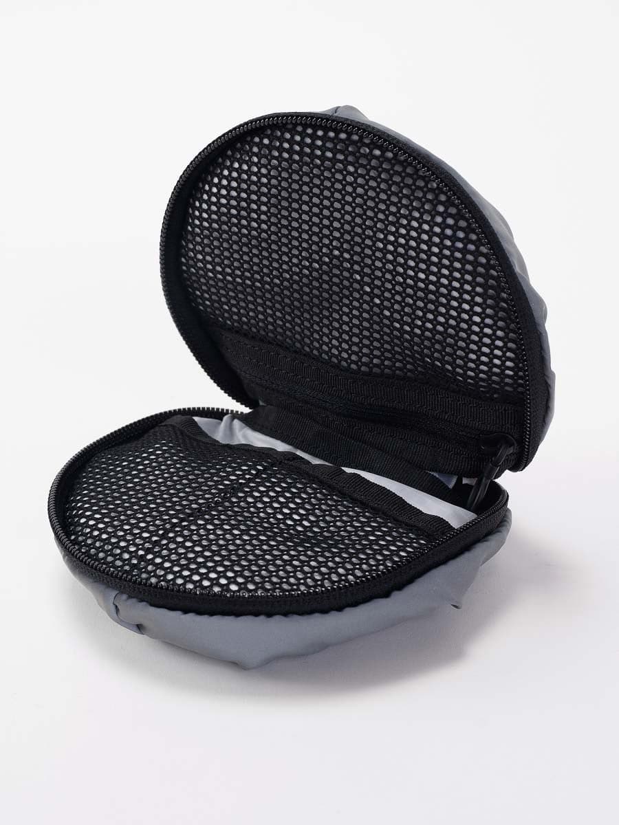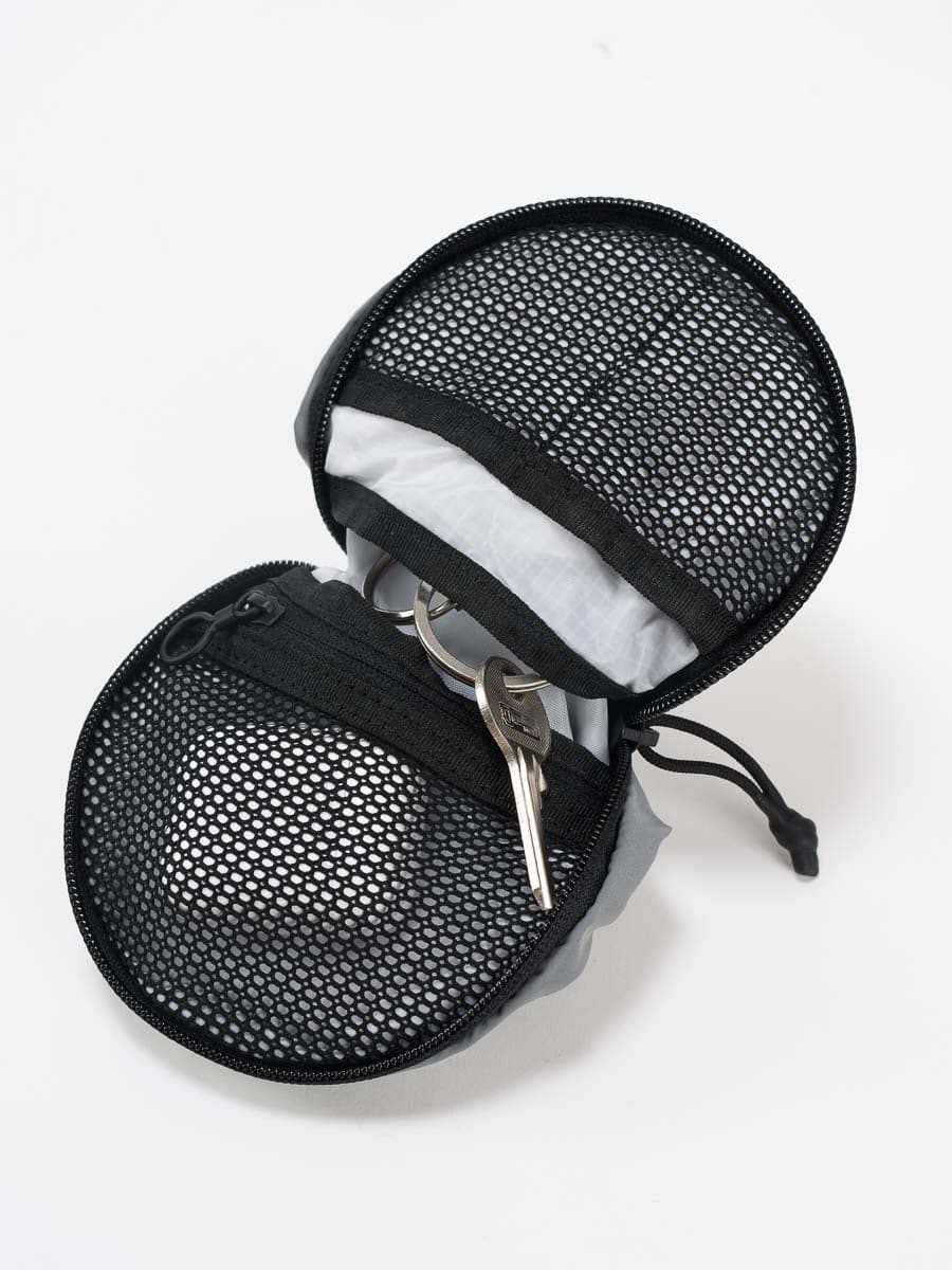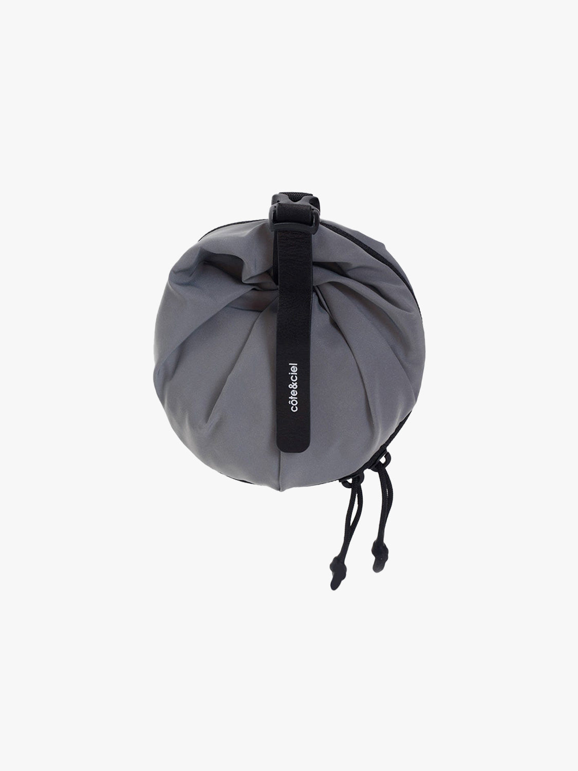 The AÓOS XS is a small twisted pouch with five separate inner compartments, one of which can be zipped up to hold small items in place. The all-around zipper allows for a full unfolding of the pouch. A leather strap secured by a buckle on the outside can be opened and the AÓOS attached to other bags as a small bag charm.