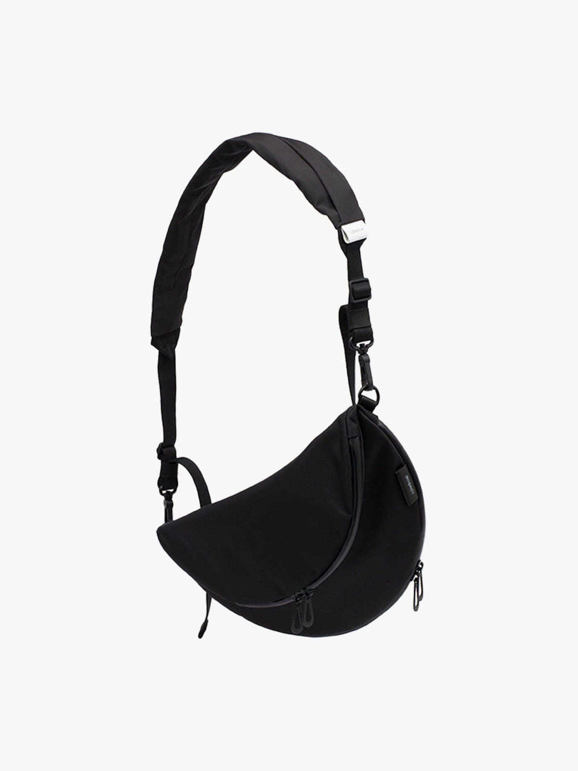 The moon-shaped HALA S crossbody has a practical internal zippered pocket and features a detachable eyewear pouch positioned under the flap. The main compartment is extendable; the zip at the base of the bag opens up to reveal a panel of light yellow, bringing an optional splash of colour to this black bag while increasing the volume. The ADDA shoulder strap can also be worn separately as a minimal crossbody.