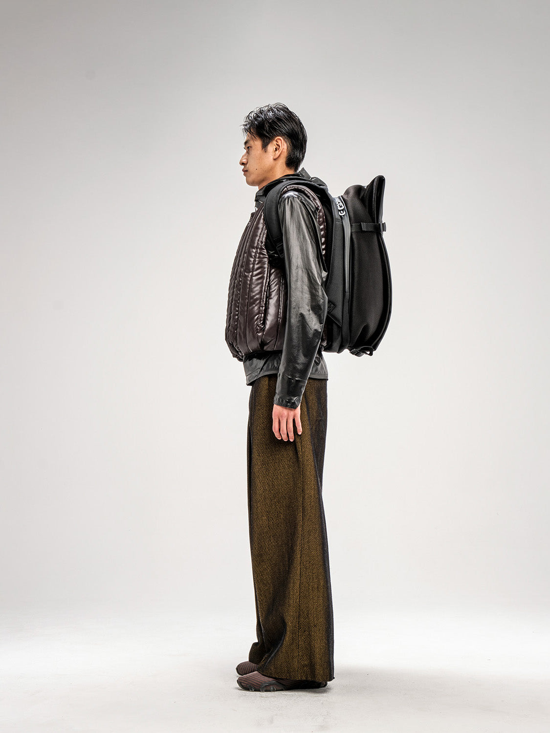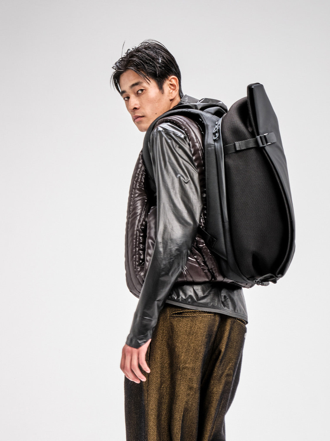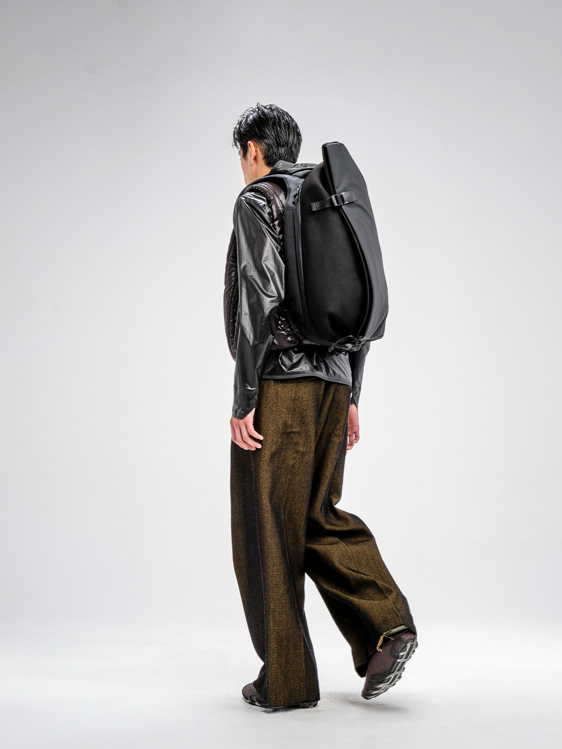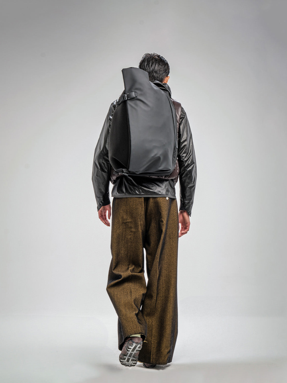 Conceived for those who want a bag that combines a futuristic design statement with practicality and comfort, this new version is fabricated from a water-repellent coated polyester with a tactile rubberized finish, complemented with a light grey interior lining and breathable mesh on flaps, straps and back panel.