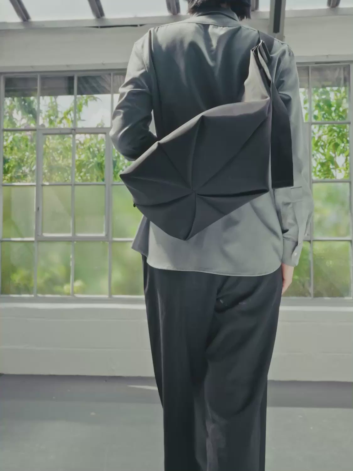 Its striking origami-inspired shape creates a sculptural silhouette, blending practicality with contemporary aesthetics.