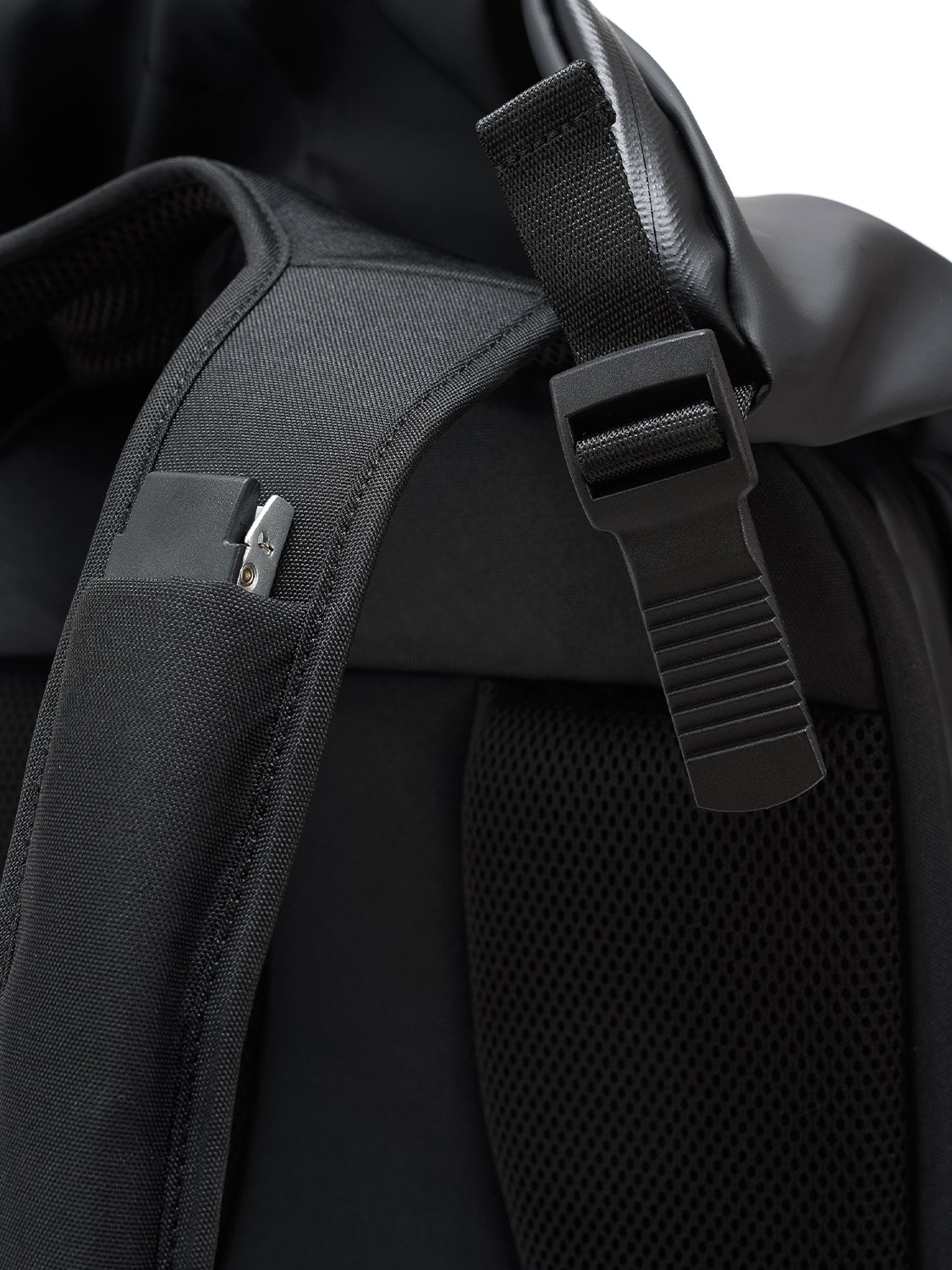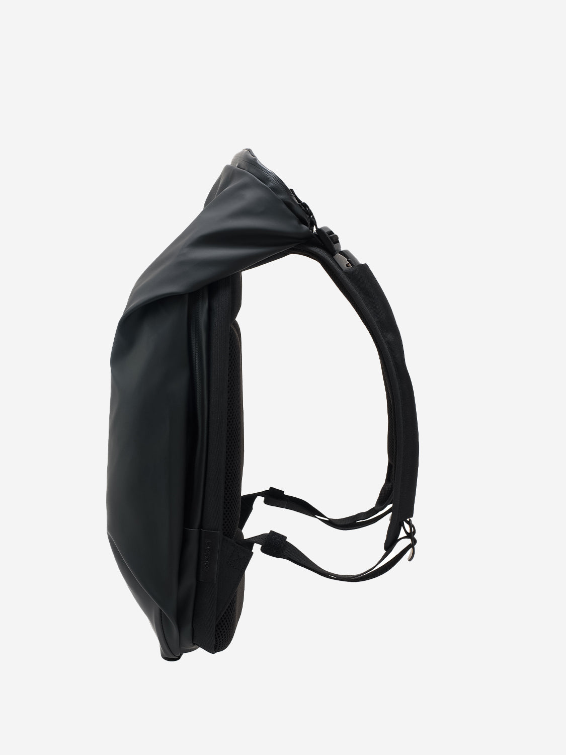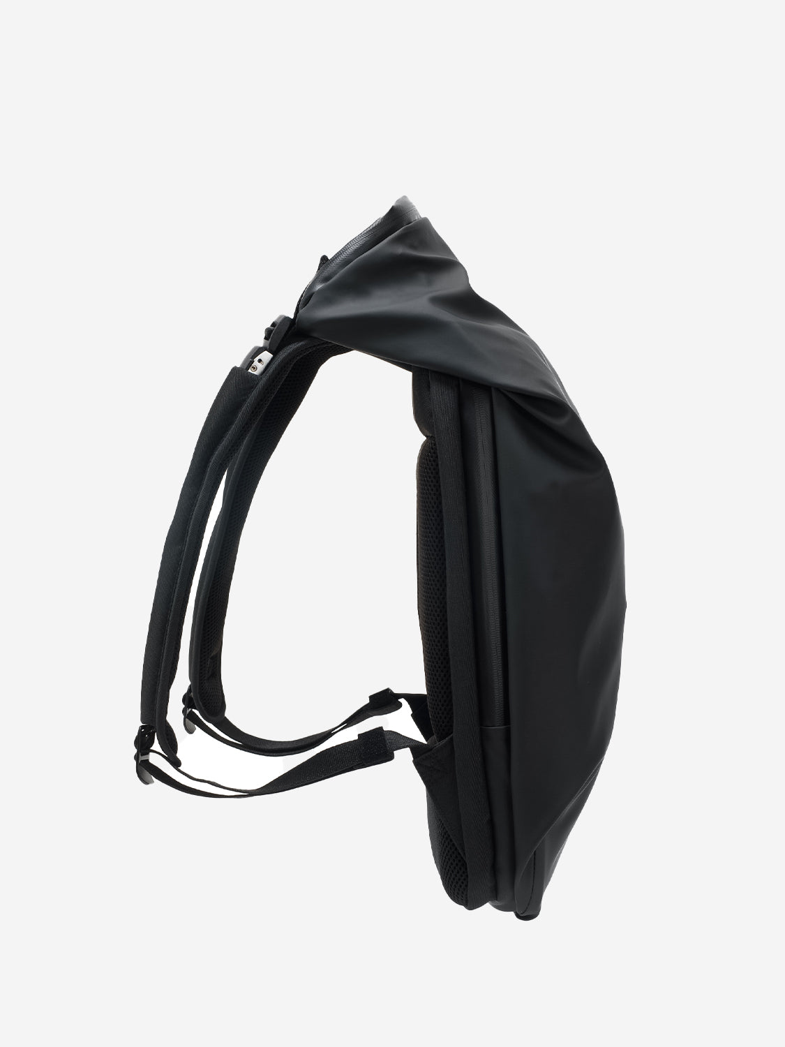 The body of the NILE S Obsidian is made from a water-repellent coated polyester with a tactile rubberized finish complemented by breathable mesh lined straps and back panel. The cocoon-like shape of the NILE S opens to reveal an integral laptop pocket, which offers safe storage for devices of up to 16”.