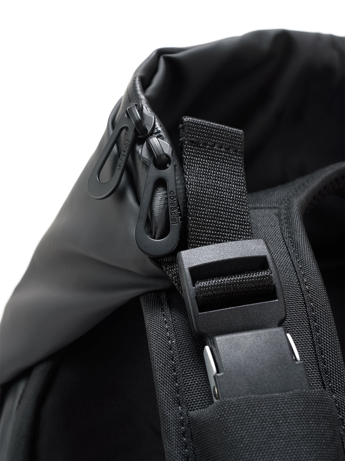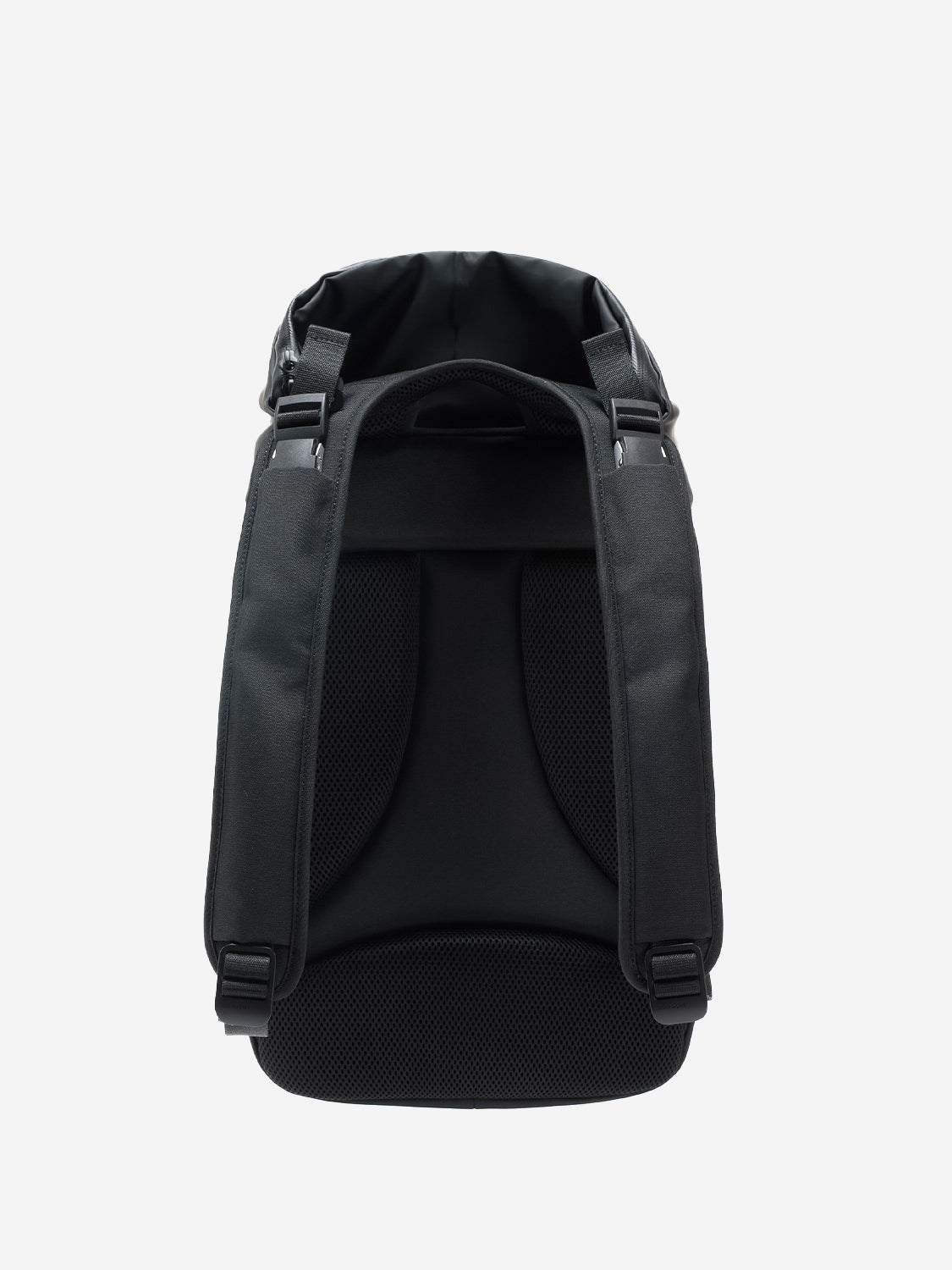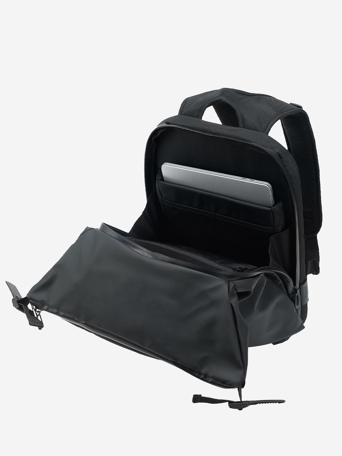 The body of the NILE S Obsidian is made from a water-repellent coated polyester with a tactile rubberized finish complemented by breathable mesh lined straps and back panel. The cocoon-like shape of the NILE S opens to reveal an integral laptop pocket, which offers safe storage for devices of up to 16”.